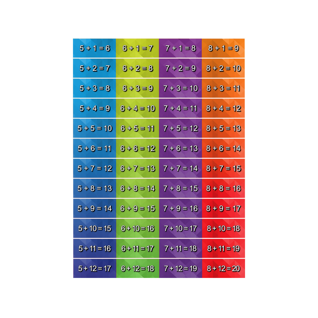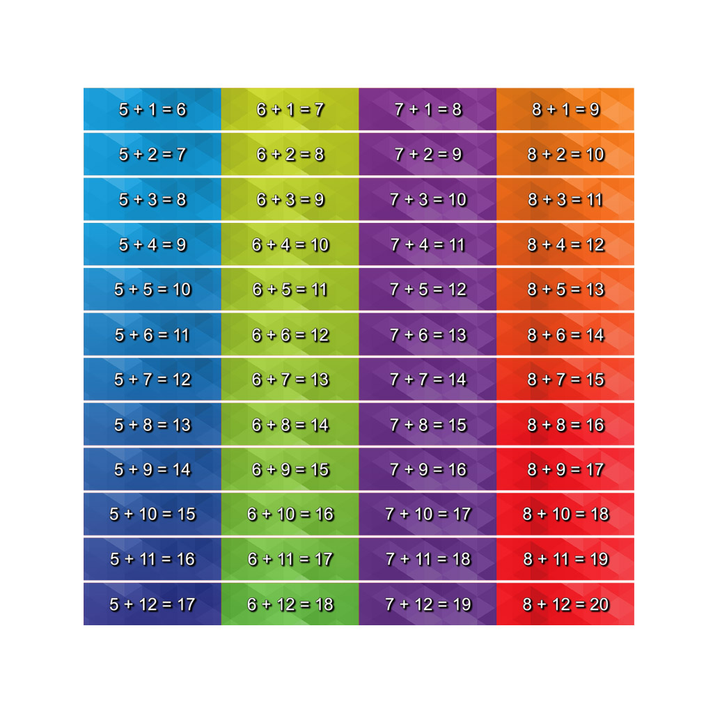 • Second set of 12 stair risers outlining the addition table (5-8)