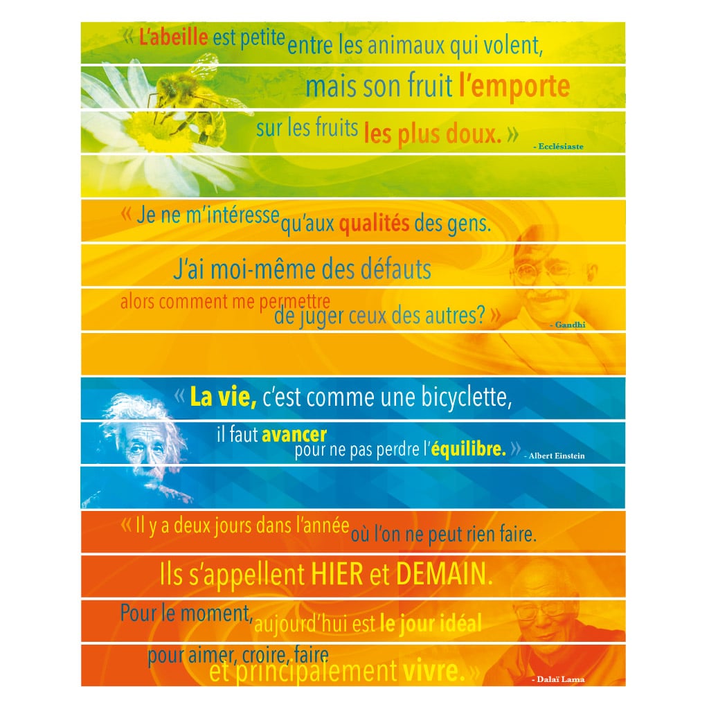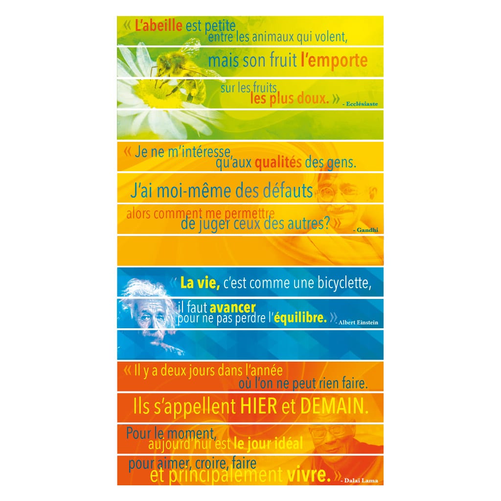 • 15 thematic stair riser decals featuring 12 inspiring messages punctuated with appealing graphic designs