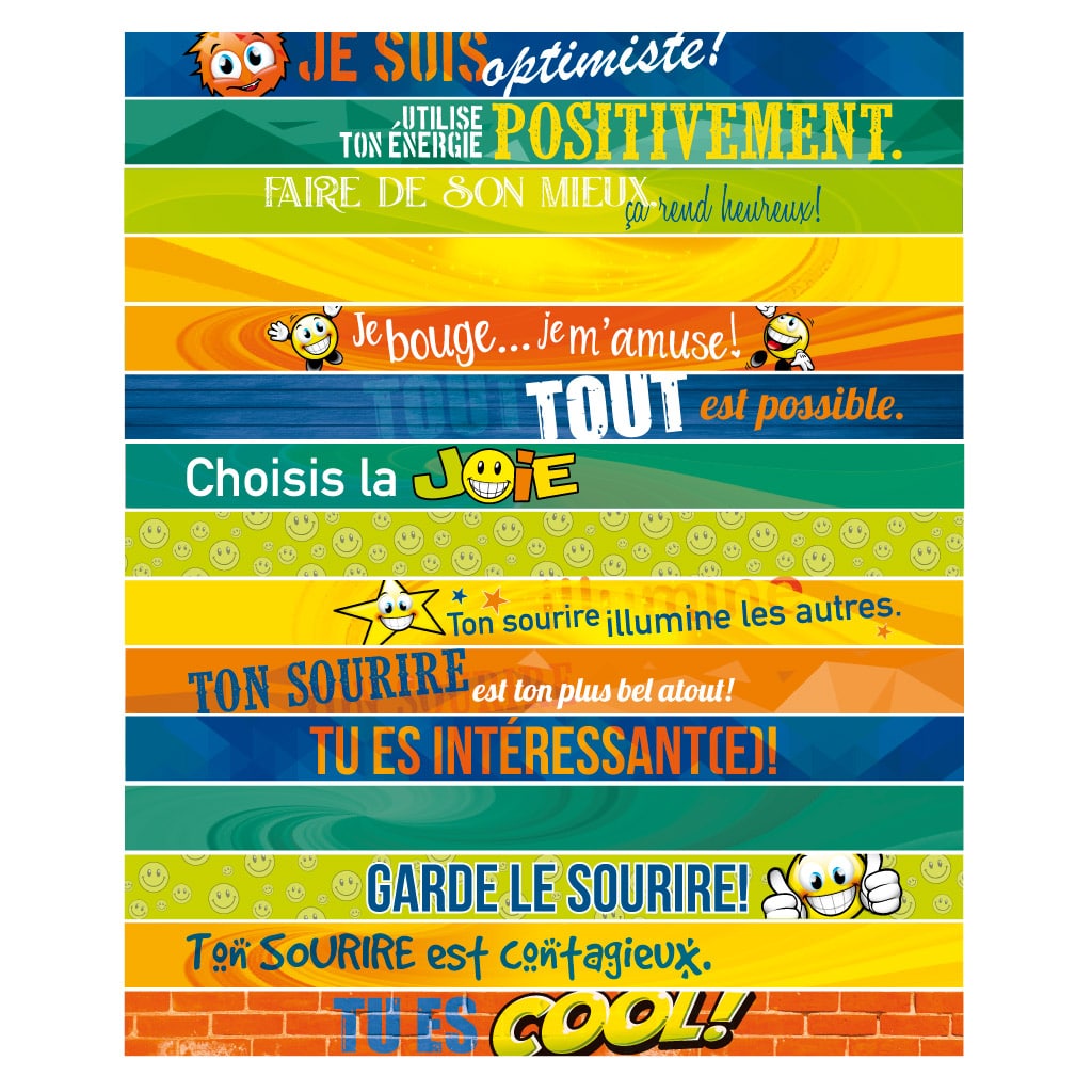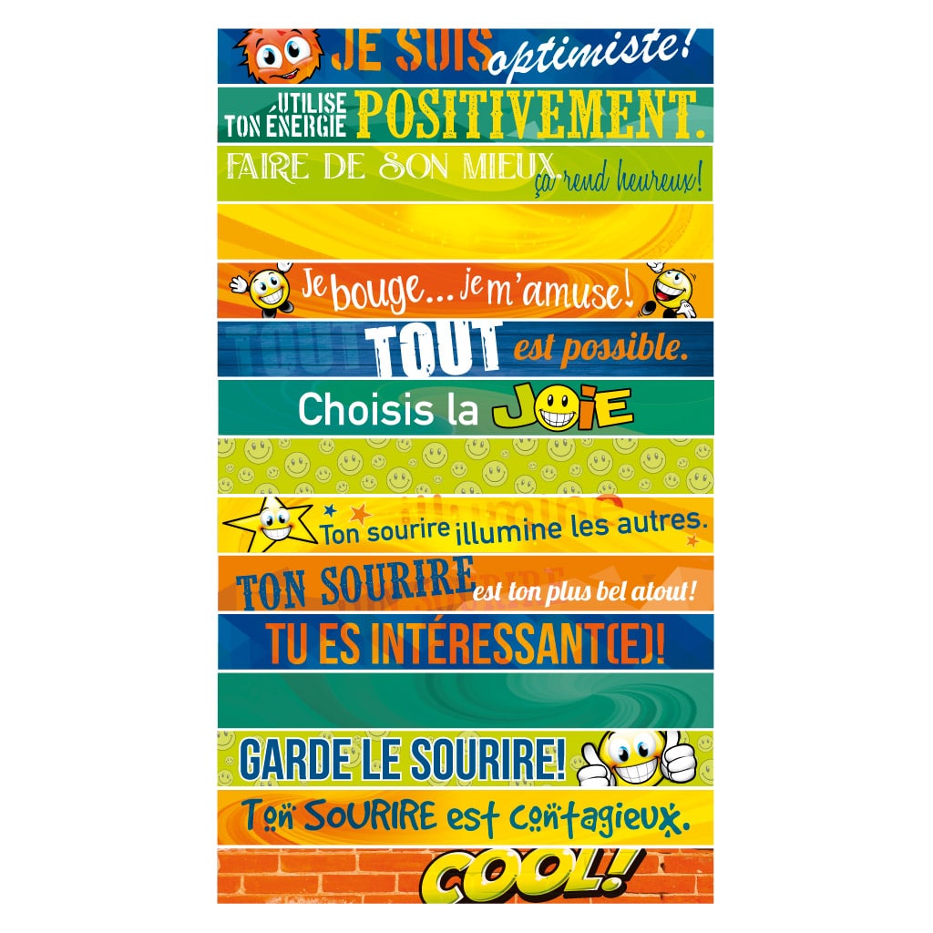• 15 thematic stair riser decals featuring 12 inspiring messages punctuated with appealing graphic designs