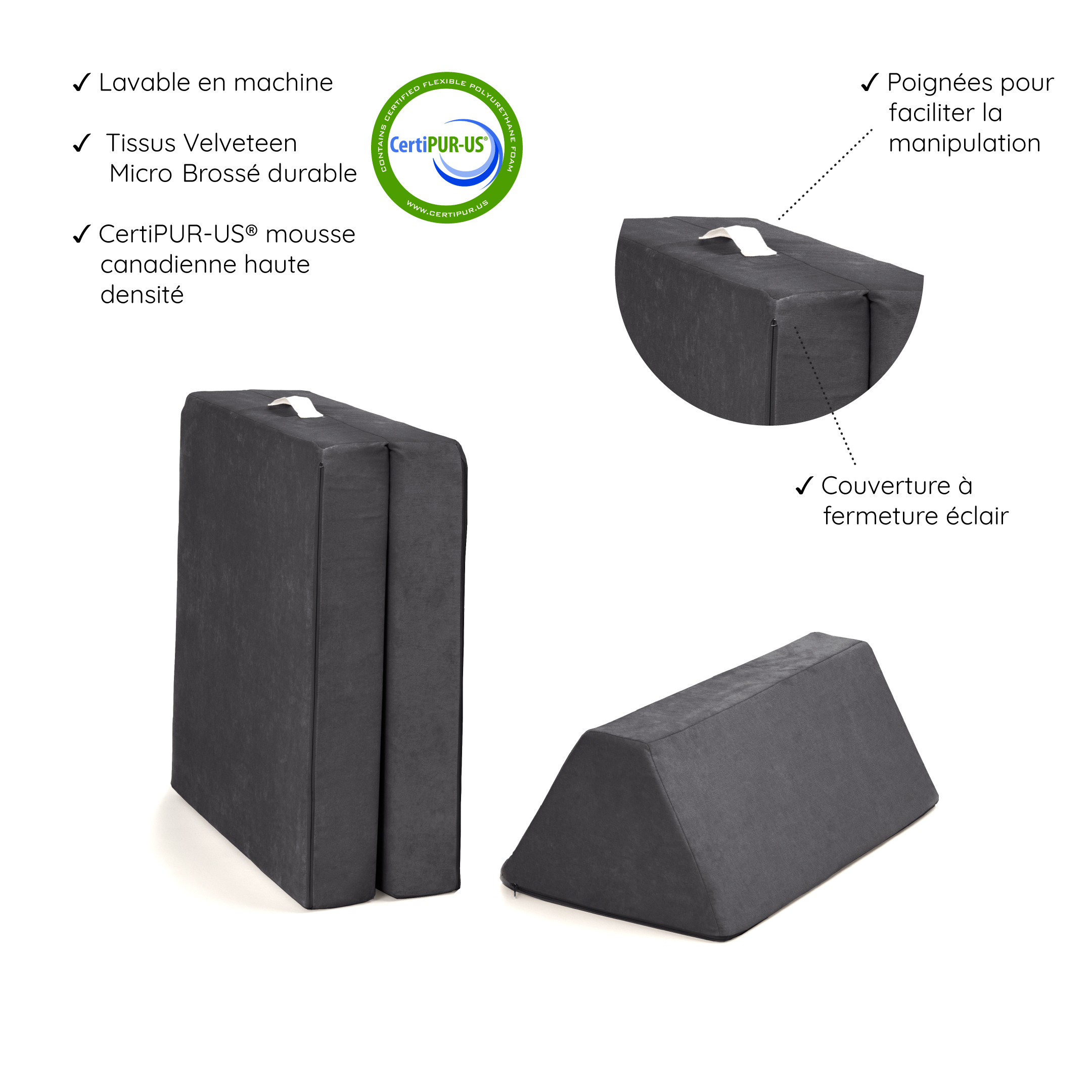 ✓ Mousse de 1,5 lb/pi3, évaluée à 60 unité de déflexion de charge d’indentation (ILD)