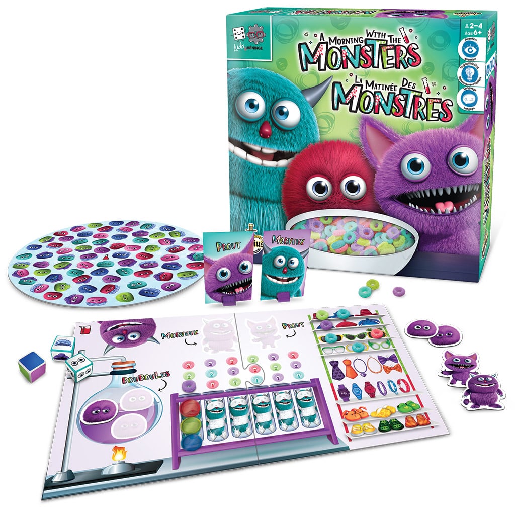 L’univers imaginaire proposé dans La Matinée des monstres suscitera certainement l’engagement des élèves dans le jeu. Le renforcement de diverses habiletés en lien avec les fonctions exécutives passera inaperçu dans un tel contexte! Chez les plus jeunes, le jeu des « Prouts » offre une belle occasion de travailler le vocabulaire en lien avec les thématiques de l’habillement et des couleurs. Au travers de ce jeu, les élèves de tous âges exerceront leur habileté à formuler des questions. En plus d’offrir une occasion de résoudre des problèmes, le défi des « Morveux » constitue une excellente initiation aux jeux de style Mastermind. Quant à lui, le jeu du « Lavoir des monstres » s’insère tout aussi bien dans un atelier, un moment de transition ou une fin de séance et permet de travailler diverses aptitudes telles que l’attention et l’observation en amenant l’élève à tenir compte simultanément de différentes caractéristiques visuelles.