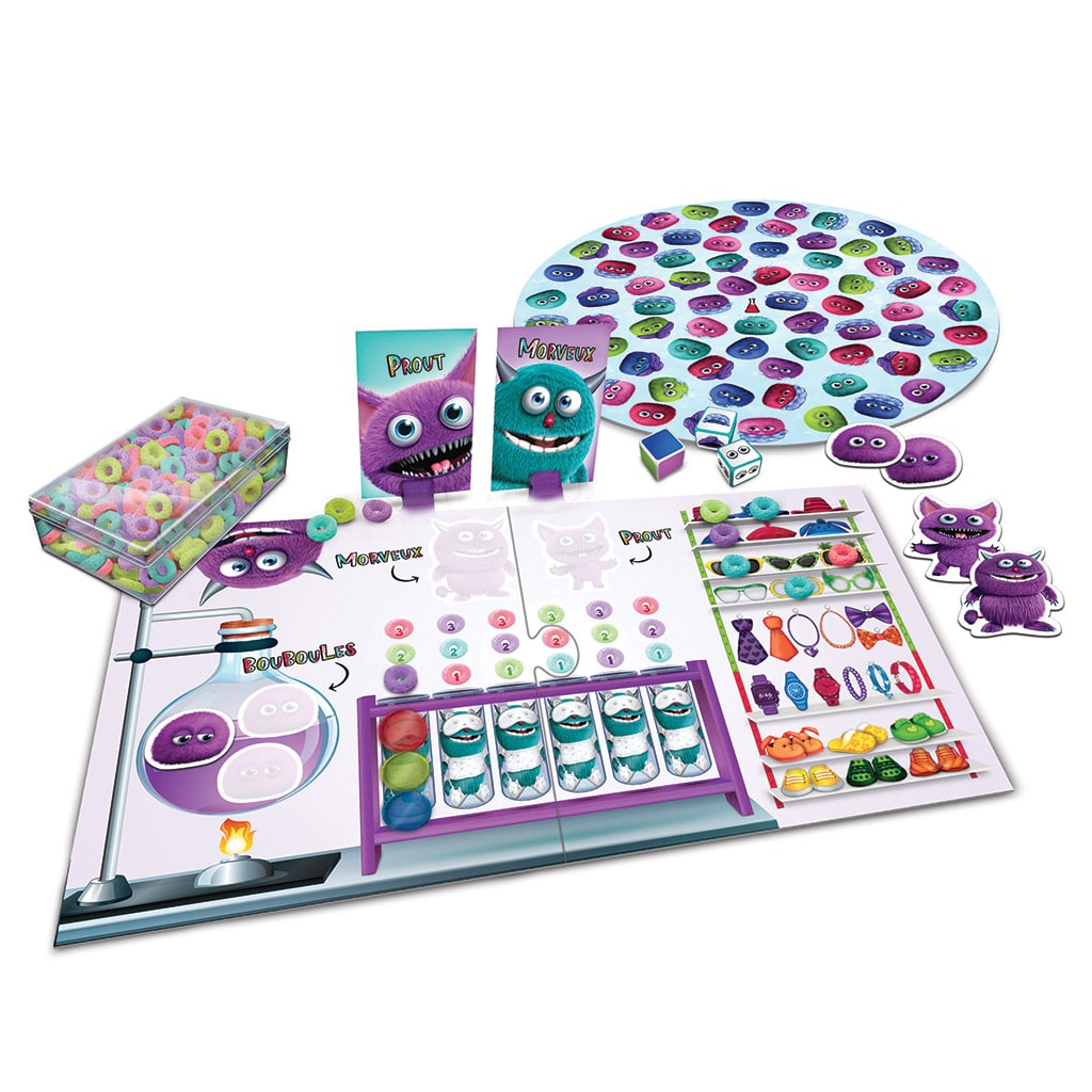 Pour y arriver, ils doivent sortir du bain leurs trois « Bouboules » grâce à leur sens de l’observation et leur rapidité d’exécution. Leur raisonnement logique les aidera à faire sortir du lit leur attachant « Morveux » qui ne veut qu’engloutir d’alléchantes céréales colorées. Finalement, l’espiègle « Prout » qui s’amuse à se déguiser sera démasqué grâce à la capacité de déduction des joueurs.