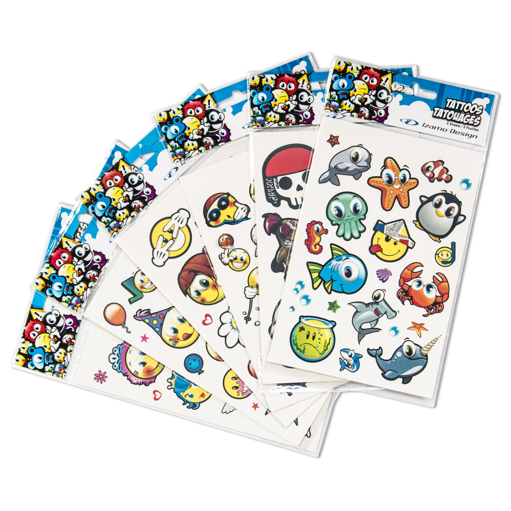 Retrouvez les amusants personnages de nos boîtes aux trésors sous forme de tatouages temporaires pour enfants. Chaque sachet contient deux feuilles et vous pouvez faire votre choix parmi les six thématiques suivantes : princesses, sports, peace and love, anniversaires, marins ou squelettes. De plus, appliquer les tatouages est un jeu d’enfant!