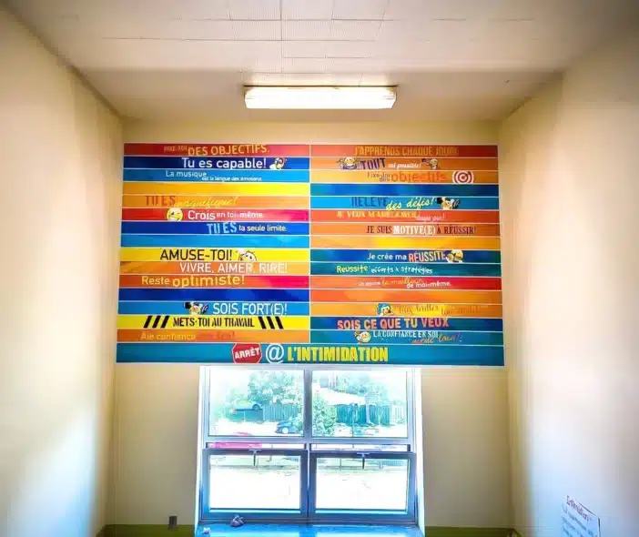 Merci à l’École Honoré-Mercier de nous avoir fait confiance pour ce projet de murale autocollante. Une idée originale afin de désamorcer l’intimidation en milieu scolaire. N’hésitez pas à nous envoyer des photos des milieux d’enseignement que vous côtoyez! En les partageant, vous pourriez inspirer vos consœurs et confrères!