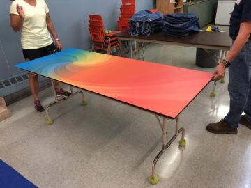 La directrice de l’école Saint-Louis de Gonzague avait le goût de redonner un bel éclat à la bibliothèque déjà existante. L’ajout de recouvrement autocollant sur le dessus des vieilles tables a complètement changé l’ambiance de cette pièce. Belle récupération!!!